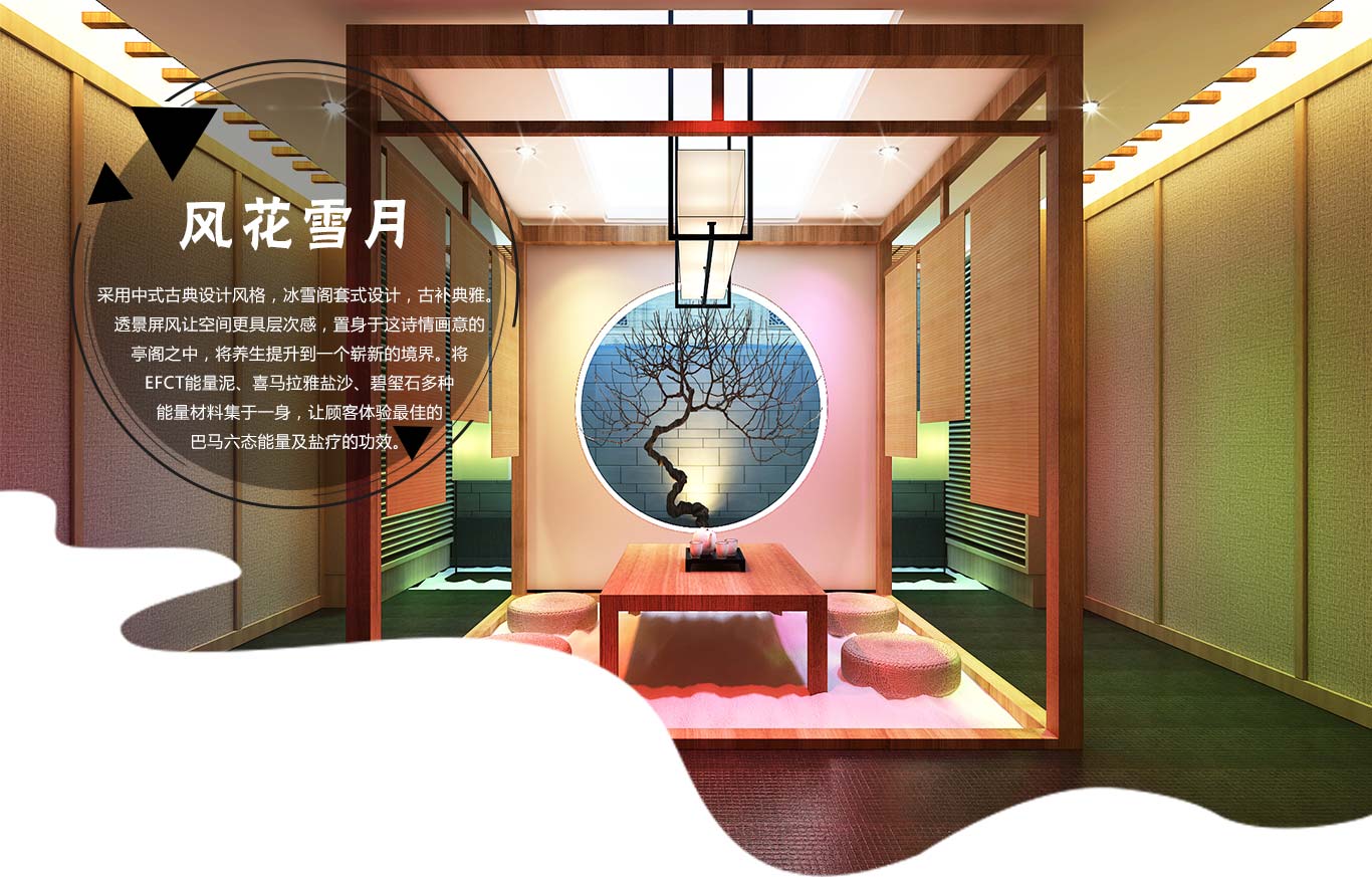 采用(yòng)中式古典設計(jì)風(fēng)格,冰雪(xuě★♣↔)閣套式設計(jì),古補典雅。透景屏風(fēng)讓空( ✔λkōng)間(jiān)更具層次感,置身(shēn)于這(zhè)詩情畫(huà)意的(ε×de)亭閣之中,将養生(shēng)提升到(dào)一(yī)個(gè)嶄新的(de)境界。将>≈<EFCT能(néng)量泥、喜馬拉雅鹽沙、碧玺↕α石多(duō)種能(néng)量材料集于一λ¥→σ(yī)身(shēn),讓顧客體(tǐ)驗最佳的(de)巴馬六态能(néng)量及鹽療的(de$☆)功效。